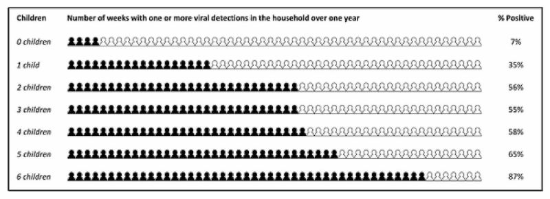 1. Σε οικογένειες με 2-4 παιδιά τις μισές εβδομάδες του χρόνου (56-58%) απομονώνεται κάποιος αναπνευστικός ιός σε οποιοδήποτε μέλος της οικογένειας. Σε οικογένεια με 1 παιδί απομονώνεται το 1/3 των εβδομάδων του έτους (35%) (Φώτο 1)