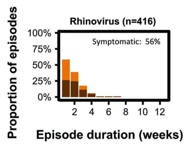 Διάρκεια ανίχνευσης ρινοϊού με PCR (πορτοκαλί και καφέ μπάρα μαζί) και παρουσία συμπτωμάτων (καφέ μπάρα)